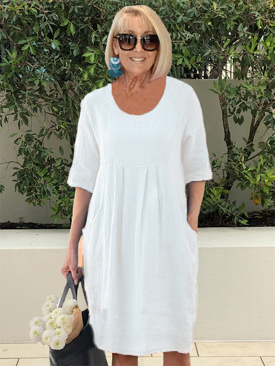 Dress length: Mid-length dressCollar type: CrewneckPopular elements: PocketFabric name: CottonStyle type: ElegantSleeve length: Half sleeve