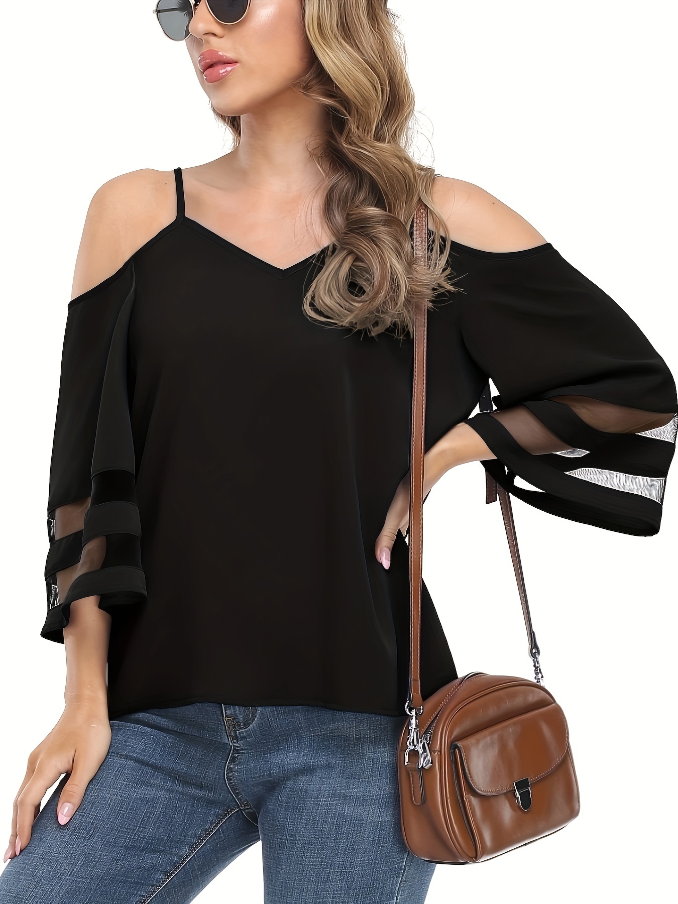 • Chic Sheer Panel Spaghetti Strap Top - Breezy Off-Shoulder Design for Spring/Summer - Stylish Womens Wear